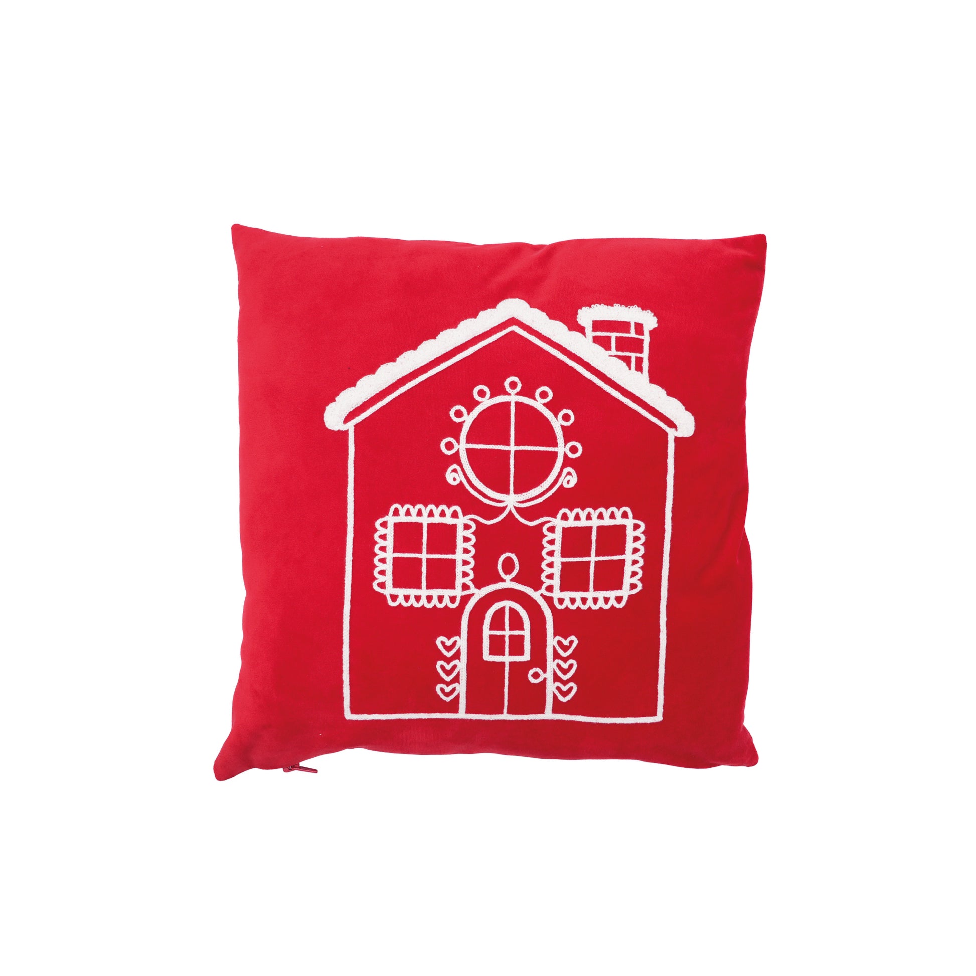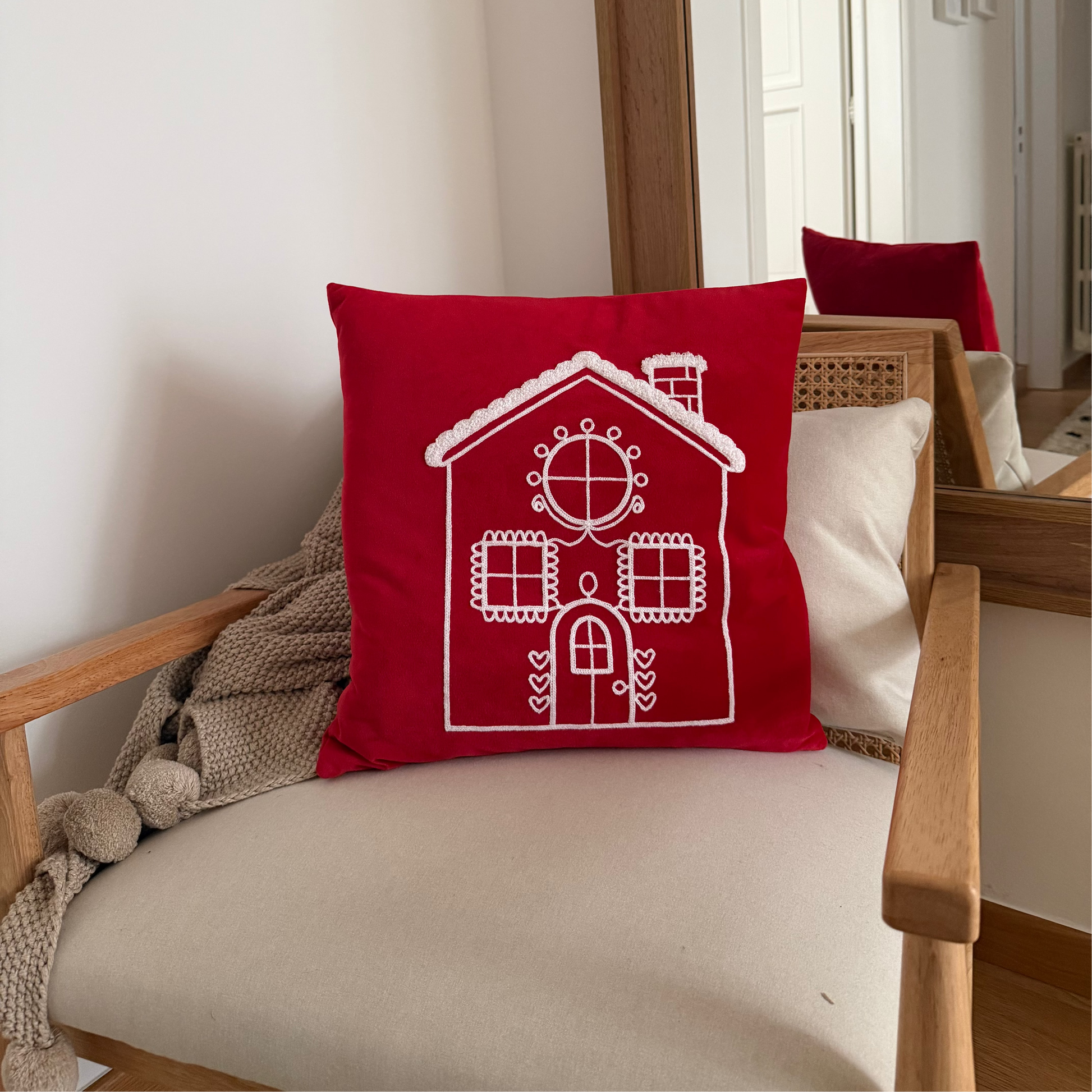 Ispirato alla magia del Natale, il cuscino "Casetta di Pan di Zenzero" unisce il velluto rosso più soffice a un raffinato ricamo bianco. Disegnato da me, misura 45x45cm ed è il dettaglio perfetto per aggiungere calore e dolcezza alla tua casa durante le feste.